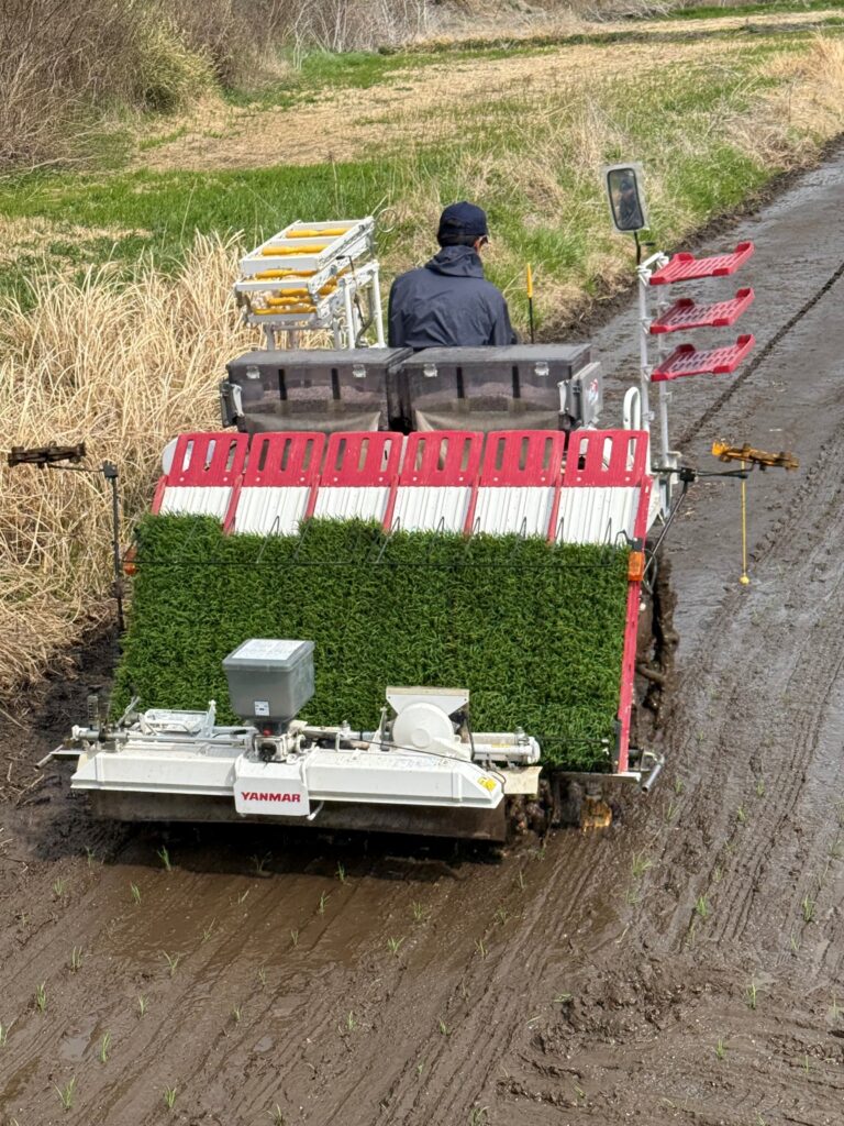 3月から育苗箱に種をまき、ハウス内で稲を生長させ、圃場を代かきし、田植えの準備をし、田植え当日は、朝早くから準備をして下さり、生産者様が美味しいお米が出来る様、心を込めて田植えをして下さいました。